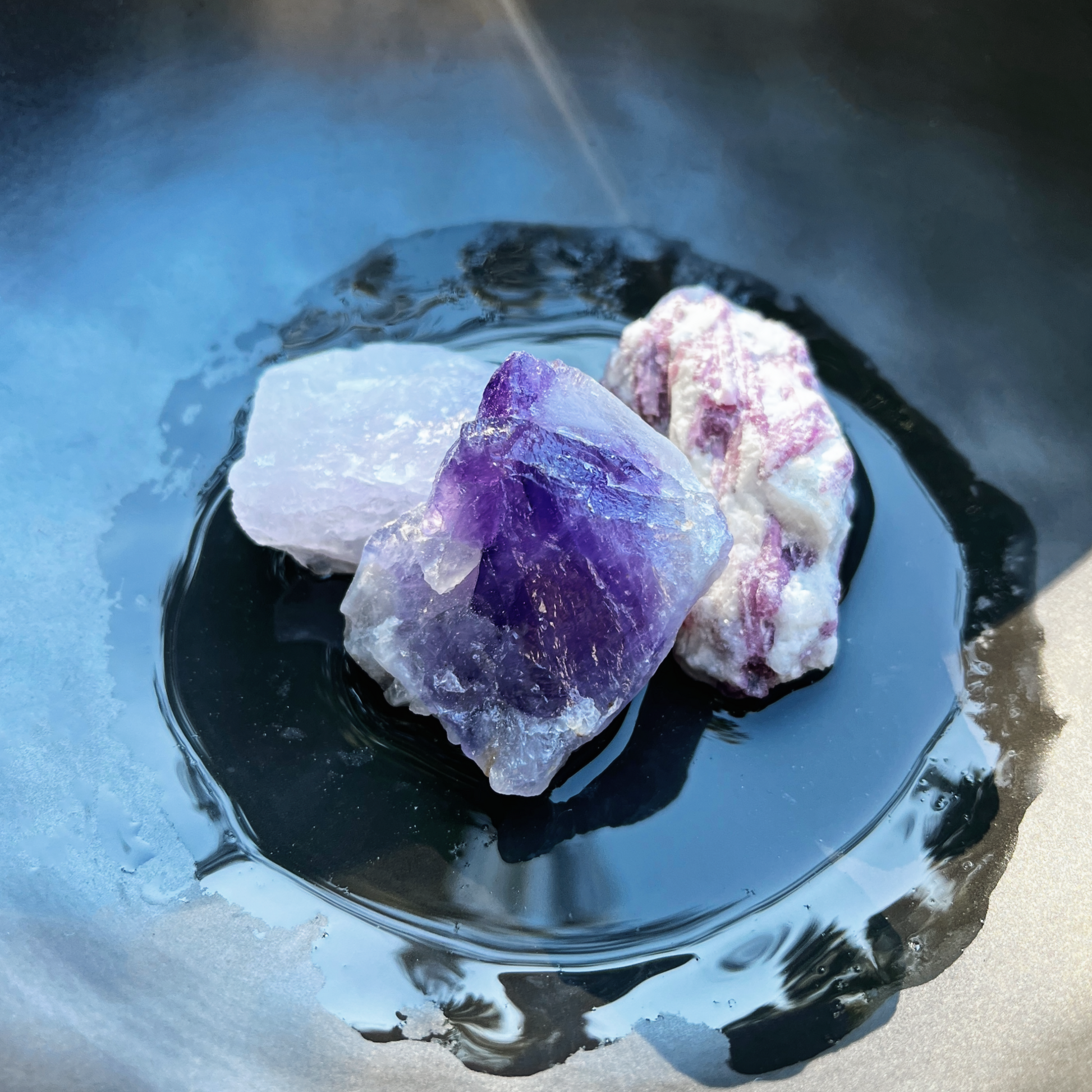 Rose Quartz, Pink Tourmaline, Chevron Amethyst.
